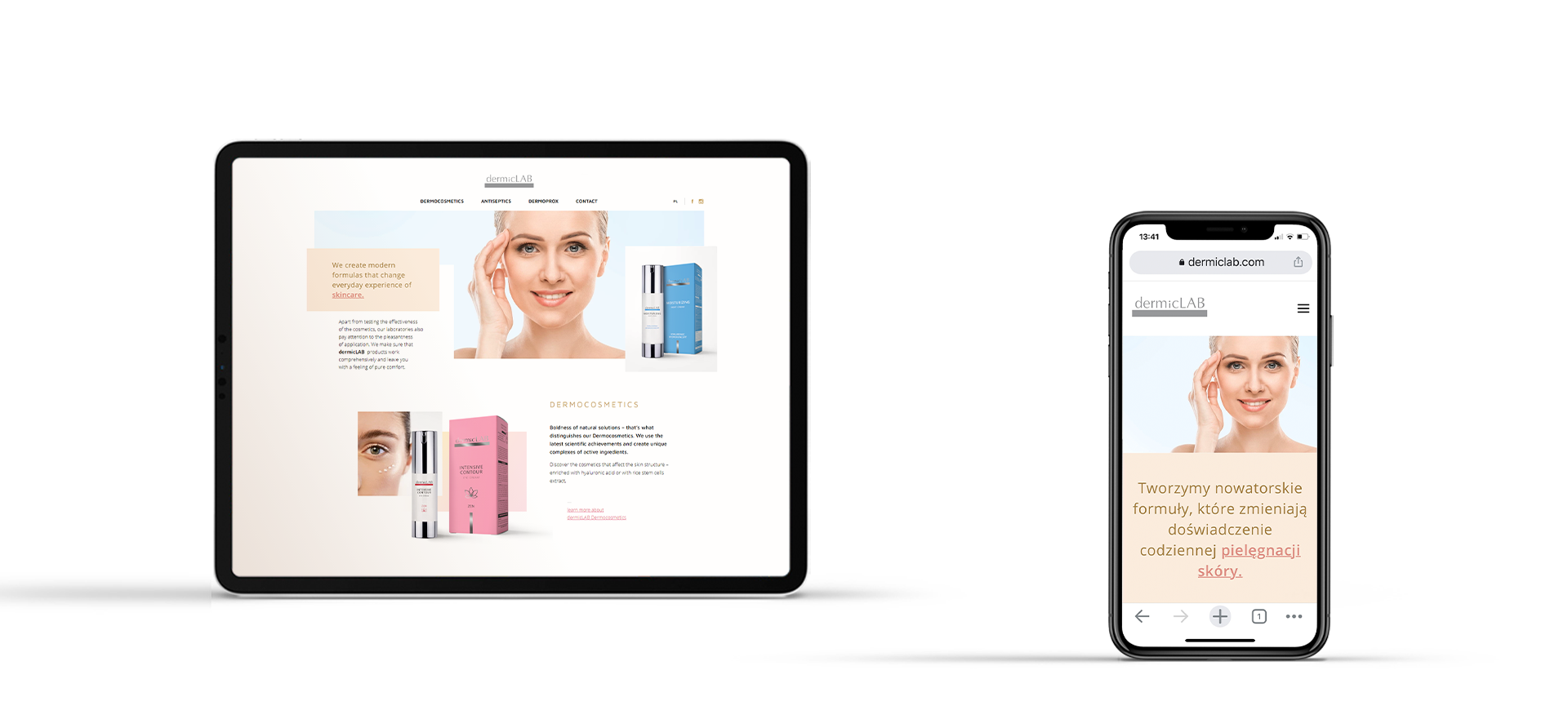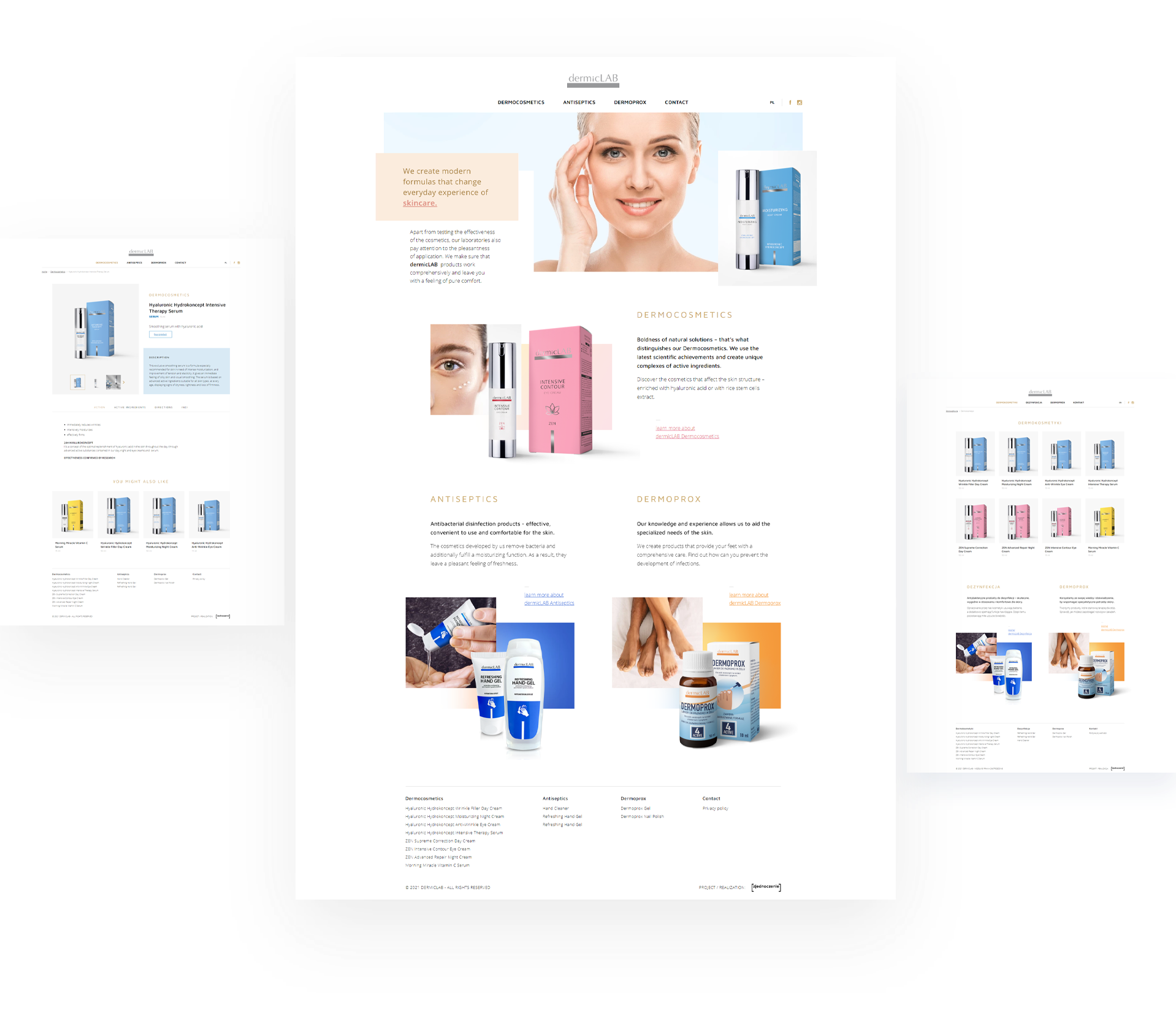 Dermiclab opiera swoje formuły na medycznych podstawach. W ofercie znajdują się wysokiej klasy kosmetyki, ale też środki dezynfekujące i lecznicze. Podczas tworzenia nowej strony WWW zadbaliśmy o ekspozycję każdej kategorii. Całość usubtelniliśmy estetycznymi aplami oraz ich animacjami.