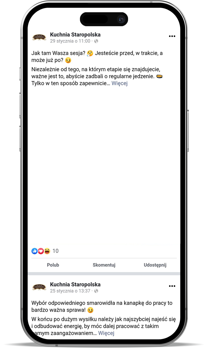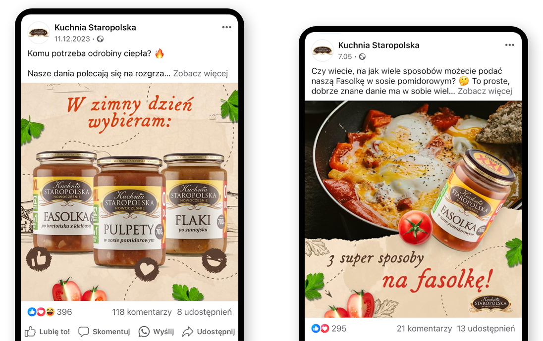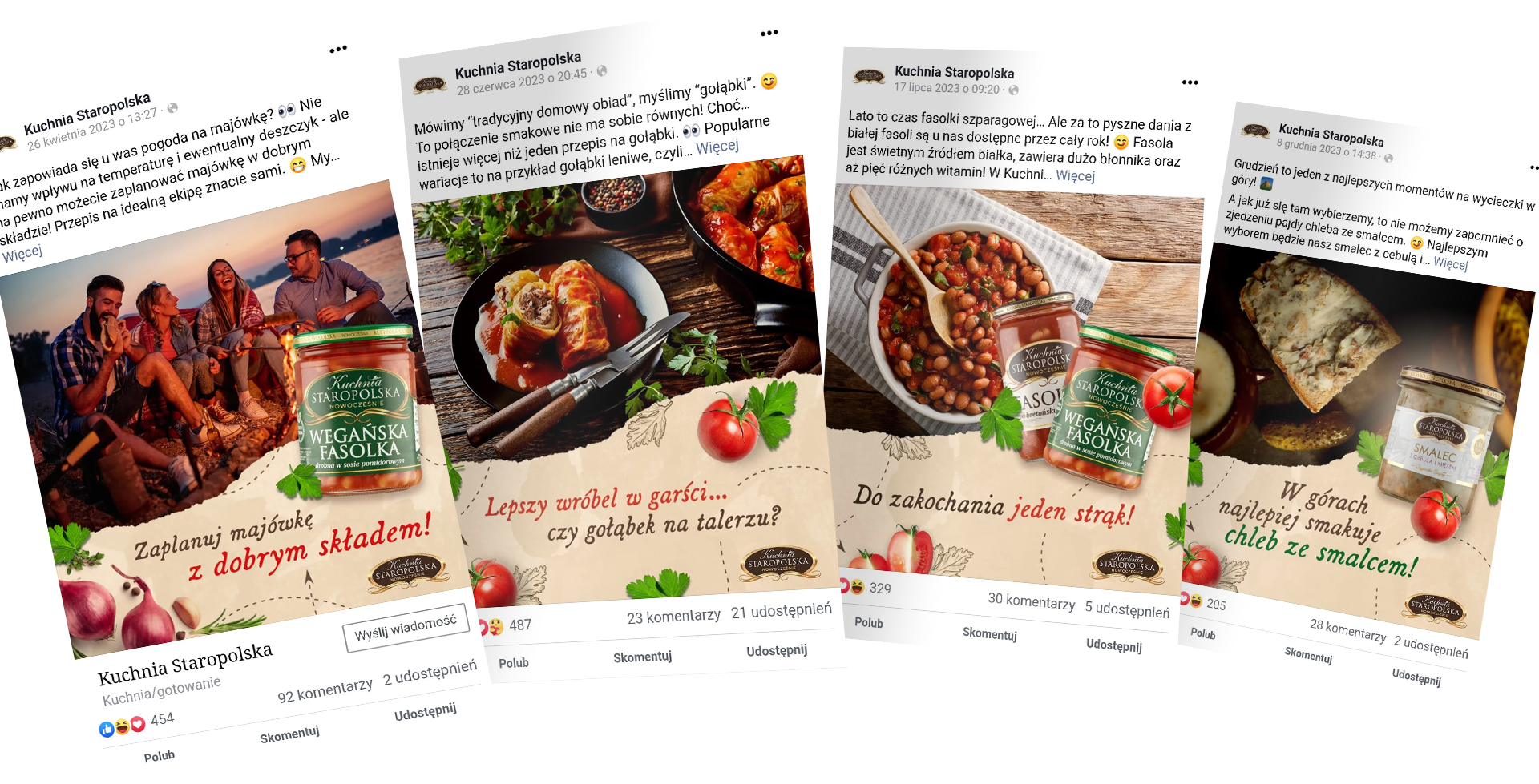 W połowie 2022 roku Kuchnia Staropolska zwróciła się do nas z prośbą o wsparcie w prowadzeniu ich profilu na Facebooku. Na potrzeby komunikacji marki w mediach cyfrowych, stworzyliśmy koncepcję opartą na analizie działań, konkurencji i charakterystyki grupy docelowej. Opracowaliśmy strategię, kluczowe przekazy oraz metody dotarcia do różnych segmentów odbiorców.
