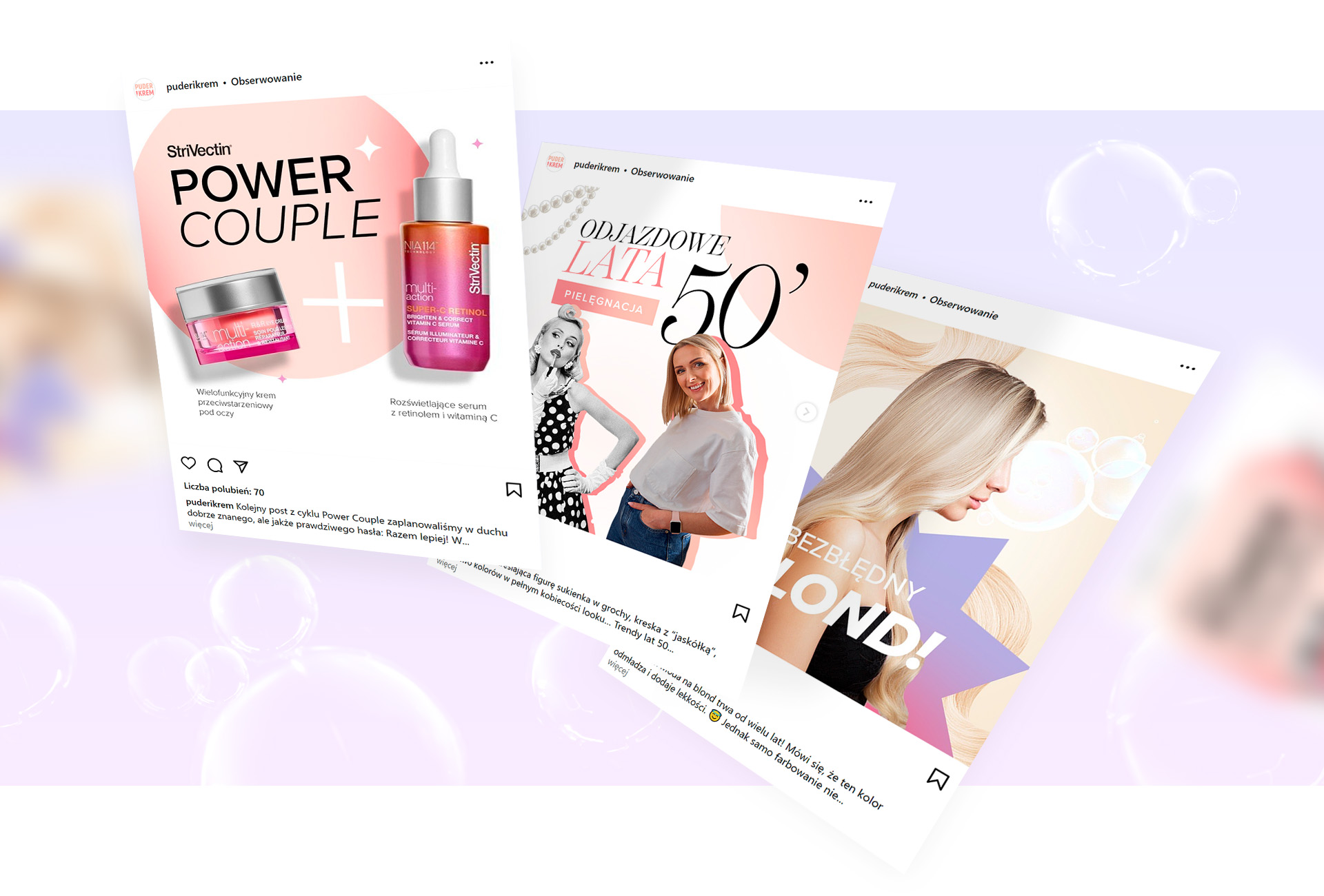 Rozpoczynając pracę przy Puder i Krem opracowaliśmy nową koncepcję komunikacji dla marki. Tworzymy content na podstawie podziału na miesiące, z których każdy ma swoje indywidualne hasło przewodnie, takie jak Troskliwość, Ekscytacja czy Kobiecość. Pozwala to jeszcze bardziej świadomie kształtować balans treści i lepiej dopasowywać posty do aktualnych potrzeb odbiorców. W trakcie współpracy odświeżyliśmy komunikację graficzną, jednocześnie zachowując key visual marki.