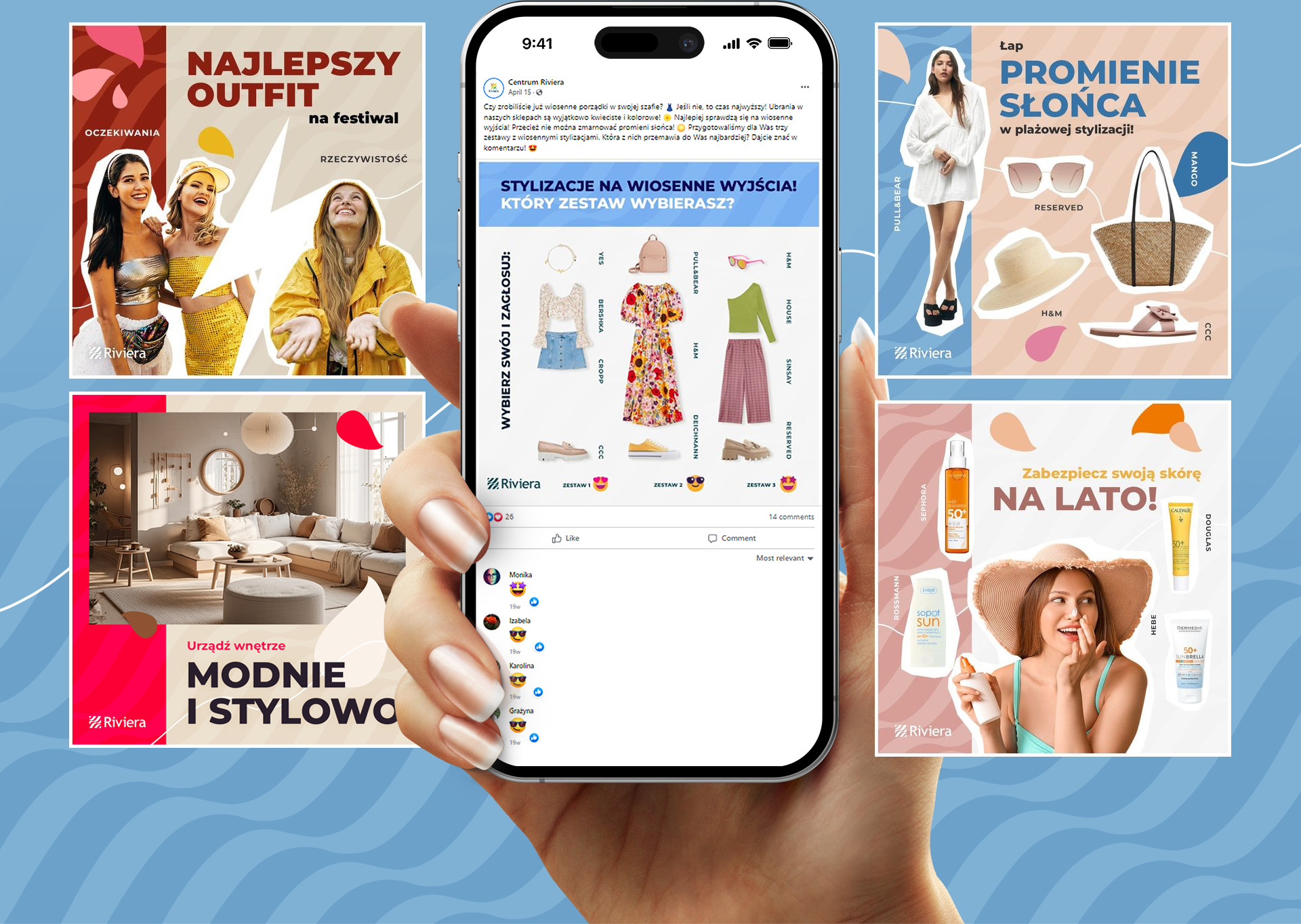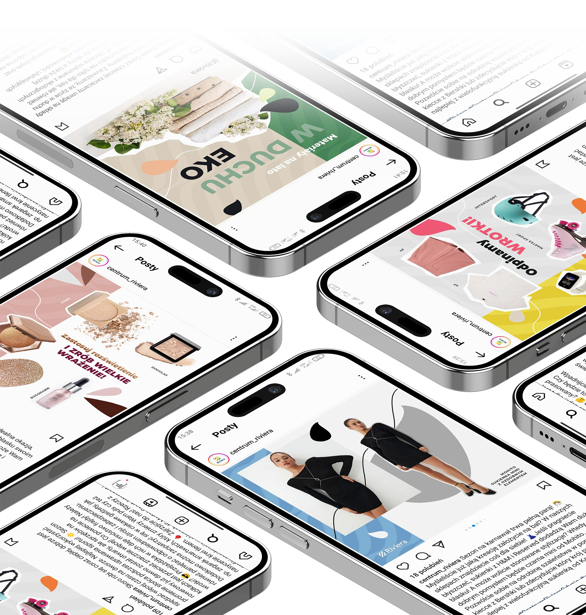 Przy tworzeniu contentu na Instagram stawiamy na inspirowanie odbiorców i pokazywanie trendów budując wizerunek Riviery jako centrum komunikującego się w nowoczesny sposób i zaangażowanego w bieżącą komunikację z klientami. Tworzymy między innymi kolaże modowe, kosmetyczne i wnętrzarskie oraz stylizacje inspirowane popkulturą i trendami, a to wszystko ubrane w atrakcyjną dla odbiorców szatę graficzną.