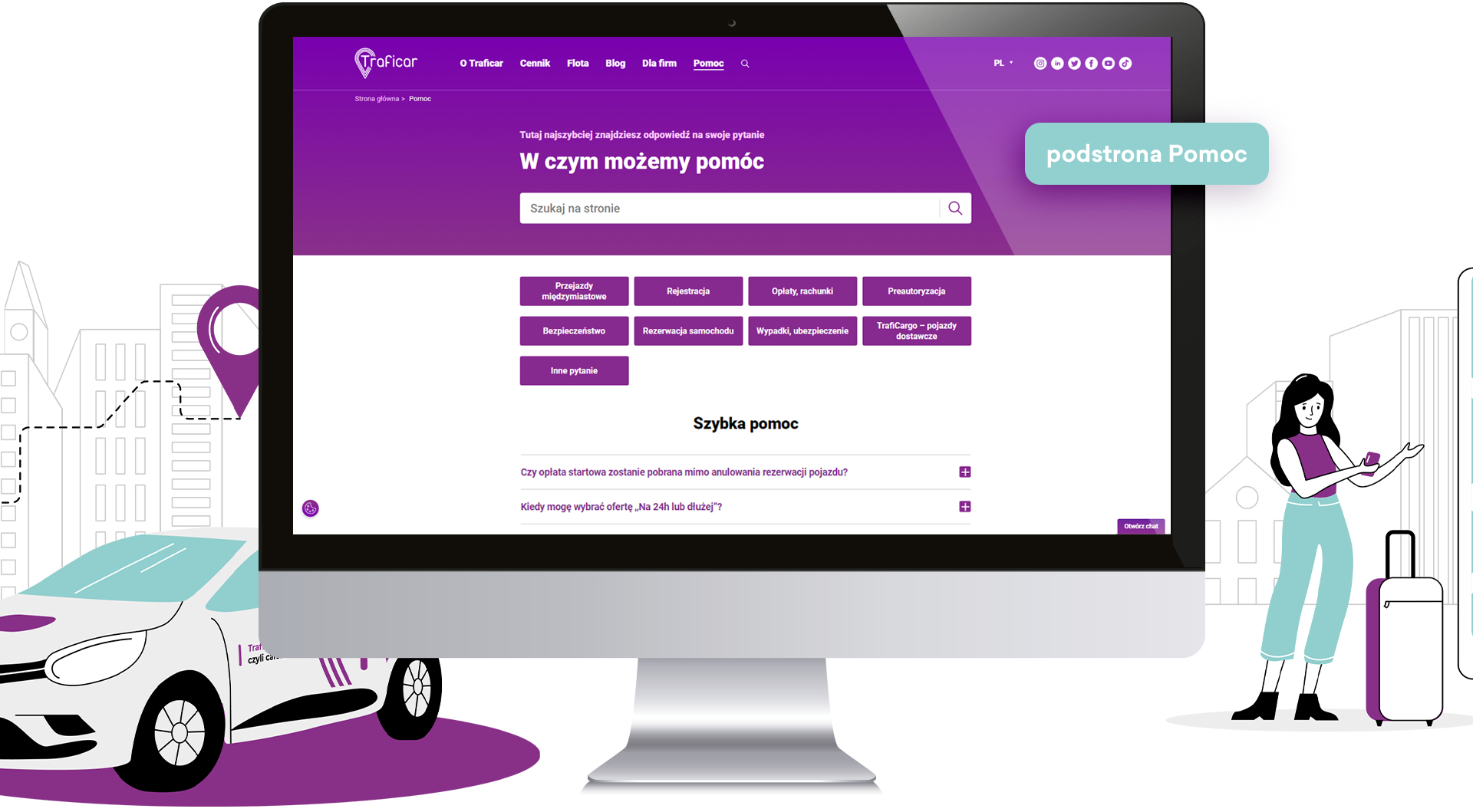 Naszym celem było stworzenie prostej i czytelnej struktury strony, pozwalającej zawrzeć wszystkie informacje w kilku podstronach. Dzięki temu serwis jest przejrzysty, intuicyjny, a użytkownik porusza się po nim bez wysiłku. Najwięcej uwagi poświęciliśmy podstronie Pomoc, stanowiącej najbardziej praktyczną część dla użytkownika. Zamieściliśmy na niej obszerne FAQ oraz oczywiście dane kontaktowe - klienci Traficara mogą szybko znaleźć odpowiedź na swoje pytanie lub, w wypadku bardziej skomplikowanego zagadnienia, uzyskać pomoc Biura Obsługi klienta.